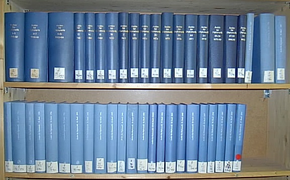 Archiv für Diplomatik, Schriftgeschichte, Siegel - und Wappenkunde. Bände 1(1955) - 57(2011), gebunden in 44 Bänden (ES FEHLT Band 31/1985). Böhlau-Verlag, Köln 1955-2011. Gr.-8°., ordentlich gebunden in Bibliotheks-Halbleinen, teils Original-Leinen, teils Original-Pappbände,. ehemaliges Bibliotheksexemplar mit Rückenschild und Stempeln ("ausgeschieden"), Einbände und Schnitt teils etwas fleckig / angestaubt, in einigen wenigen Bänden sehr vereinzelt minimale Bleistiftanstreichungen, insgesamt gut erhaltene Reihe / ex-library copy with label on spine and stamps, bindings and cutting partially a bit stained / dusty, in some volumes a very few little pencil marks, else good, (Historische Hilfswissenschaften, Urkunden-Lehre, Urkundenlehre, Palaeographie, Mittelalter, Schriftkunde, Siegelkunde, Sphragistik, Heraldik, Genealogie, Nach folger von Archiv für Urkundenforschung),.