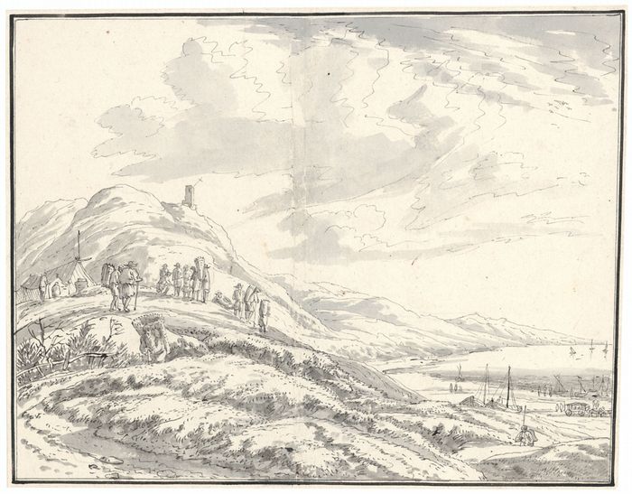 Bergige Flußlandschaft mit Bauernhütte und Landleuten bei verschiedenen Tätigkeiten, rechts am Ufer und auf dem Wasser Boote. _. Feder in Schwarz, grau laviert, mit doppelter Tuschlinie umrandet, auf Bütten. 21,7:28,3 cm, auf Büttenuntersatz montiert. Mit vertikaler Quetschfalte, die beim Aufziehen entstanden ist, die den guten Gesamteindruck der Zeichnung jedoch nicht beeinträchtigt. Provenienz: Aus dem Besitz der Nachfahren des Künstlers. Seine erste künstlerische Ausbildung erhielt der Schweizer Maler Johann Caspar Huber bei H. Wuest (1741-1821) in Zürich. 1773 hielt er sich in Basel, 1774 in Straßburg auf und war anschließend bis 1778 für J.A.B. Nothnagels (1729-1804) Tapetenfabrik in Frankfurt am Main tätig. Um sich künstlerisch weiterzubilden, besuchte er 1778 die Akademie in Düsseldorf, 1783/1784 die in Amsterdam. Anschließend hielt er sich bis 1789 in Düsseldorf auf, wo er sich verheiratete und zum Mitglied der Kunstakademie ernannt wurde. Seit 1789 war er wieder in Zürich ansässig. Nach seiner Übersiedlung nach Zürich war Huber ein geschätzter Landschaftsmaler. Zudem bemalte er für verschiedene Züricher Häuser Leinwandtapeten.
