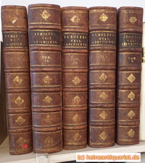 Herrn Hiob Ludolffs, Weyland Hochfürstlichen Sächsischen Geheimbden Raths, Allgemeine Schau-Bühne der Welt, Oder: Beschreibung der vornehmsten Welt-Geschichte, So sich vom Anfang dieses Siebenzehenden Jahr-Hunderts bis zum Ende desselben, In allen Theilen des Erd-Kreisses, zumahlen in der Christenheit, Sonderlich in unserm Vatterland dem Römischen Reiche, Nach und nach begeben. Zu dess Lesers besserm Unterricht Mit verschiedenen politischen Anmerckungen erläutert. (Band 1 und 2 von Ludolff selbst verfaßt, Band 3 und 4 von Christian Juncker, Band 5 von Johann Georg Pritius und Johann Michael von Loen). Frankfurt am Main, Johann David Zunner (Bände 1 und 2, Bände 3 und 4: Zunner und Johann Adam Jung, der 5. Band . (Band 1 und 2 von Ludolff selbst verfaßt, Band 3 und 4 von Christian Juncker, Band 5 von Johann Georg Pritius und Johann Michael von Loen). Frankfurt am Main, Johann David Zunner (Bände 1 und 2, Bände 3 und 4: Zunner und Johann Adam Jung, der 5. Band nur bei Jung) und Adam Jung, 1699 - 1731. 5 Bände [alles!]. Dekorative, etwas spätere Halblederbände über acht Bünden mit Rückenvergoldung, breiten Lederecken und allseitigem Sprenkelschnitt. Mit fünf ganzseitigen Titelkupfern und hunderten von kleineren und größeren Kupfern im Text (ca. 301) und auf 11 Tafeln (mit 16 Kupfern). (37,5 x 25 cm) Gr.4°. - Hiob Ludolf, Erfurter Universalgelehrter der Barockzeit und "Begründer der Äthiopistik in Europa", sein Geburtstag jährt sich 2024 zum 400sten Mal - VD17 23:298342H (Nur Band 1, "Ab Bd. 2 nicht zum VD17 gehörig" [jedoch die Bände 2 bis 5 nicht in VD18]). Graesse IV, 291. Die Einbände etwas berieben und bestoßen, teils Schabspuren auf den Deckeln. Vor- und Nachsätze erneuert. Innen, bis auf minimale Einrisse, vereinzelte Bräunungen und wenige Wurmspuren erfreulich frisch. Mit zahlreichen handschriftlichen Anmerkungen in Tinte von alter Hand in den Rändern, die Kupfer ebenfalls alt, aber teils erratisch mit Rötel numeriert. Möglicherweise fehlen Tafeln, da die Literatur - je nach Zählweise und Genauigkeit der Verleger und Buchbinder - abweichende Kollationen angibt, hier jedoch ein sehr großer Bestand an Kupfern, wobei die kleineren Kupfer in den Texten alle vorhanden sind, wie auch die großen Titelkupfer. Bd. 1: 1 Blatt (Schmutztitel recto, verso "Inhalt des Kupffer=Tituls"); 1 Blatt (ganzs., gest. Frontisp.); 1 Blatt (Haupttitel in rot und schwarz); 2 Blätter (Vorrede: mindestens 1 Blatt fehlt!); 3 Blätter (ganzs. Kupfert.); 4 Blätter ("Summarische Vorstellung"); 808 Spalten (= 202 Blätter); 609 Spalten (=152 Blätter) mit 84 kleinen Textkupfern; 23 Blätter (Register). Bd. 2: 1 Blatt (ganzs., gest. Frontisp.); 1 Blatt (Titel); 2 Blätter (Vorrede); 3 Blätter (je zwei Blätter mit je zwei halbseitigen Stiche, ein Blatt mit ganzseitig gest. Portraitmedaillons); 1744 Spalten (= 436 Blätter, zwei davon des weißen Randes beraubt, Spalten 929 bis 936 betroffen, kein Textverlust) mit 56 kleinen Textkupfern; 16 Blätter (Register, davon acht ebenfalls ohne den weißen Rand, der ungeschickt abgeschnitten wurde, teils minimaler Buchstaben- oder Zahlenverlust). Bd. 3: 1 Blatt (ganzs., gest. Frontispiz von Joseph de Montalegre, Nürnberg)); 1 Blatt (Titel); 8 Blätter (Widmung/ Vorrede/ Literaturverzeichnis); 2 Blätter (mit blattgroßen, gestochenen Portraitmedaillons); 2 Blätter (mit je zwei halbseitigen Stichen); 1462 Spalten (= 365 Blätter) mit 62 kleinen Textkupfern; 21 Blätter (Register). Bd. 4: 1 Blatt (ganzs., gest. Frontisp.); 1 Blatt (Titel); 2 Blätter (Widmung/ Vorrede); 1692 Spalten (= 423 Blätter) mit 48 kleinen Textkupfern; 29 Blätter (Register). Bd. 5: 1 Blatt (ganzs., gest. Frontisp.); 1 Blatt (Titel); 2 Blätter (Widmung/ Vorrede); 1 Blatt mit 2 kleineren Stichen; 988 Spalten (= 247 Blätter); 476 Spalten (= 119 Blätter) mit insgesamt 51 kleinen Textkupfern; 21 Blätter (Register). "Einer der gebildetsten Männer des späten 17.Jahrhunderts °(Ludolf 1624 - 1704]; seine sprachlichen und historischen Arbeiten können für seine Zeit als vorbildlich gelten ... (NDB)" schaffte es nicht, das gesamte 17.Jahrhundert wie geplant zu bearbeiten, er starb bereits Jahre vor Erscheinen des dritten Bandes (1713) und auch den diese Herkulesaufgabe übernehmenden Verfassern gelang es nicht. Juncker (1668 - 1714) erledigte die Bände 3 und 4 (bis 1669); das Werk endet aber plötzlich im fünften und letzten, von Pritius (1662 - 1732) bearbeiteten Band mit dem Jahr 1688. Mit "C. Liska in. em. f." sind einige der kleineren Textkupfer signiert. Das große ganzseitige Titelkupfer des ersten Teils mit "Romano De Hooghi ... Inv. Et Sculp." und das des dritten Teils von "P. Decker Junior del." und "Joseph de Montalegre sculpsit Norimberge" bezeichnet. * Auf Wunsch senden wir Ihnen umfangreiche weitere Anmerkungen. * [Seltene und wertvolle Bücher].